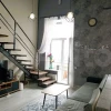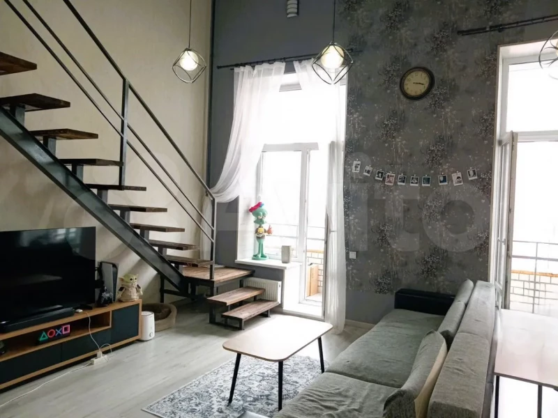 Площадь у этой двушки — 50,2 метров квадратных, а одной кухни — 17 кв. м. Находится она на десятом этаже, а в самой квартире есть лестница на отведенное для работы место. Выйти подышать свежим воздухом всегда можно в лоджию.