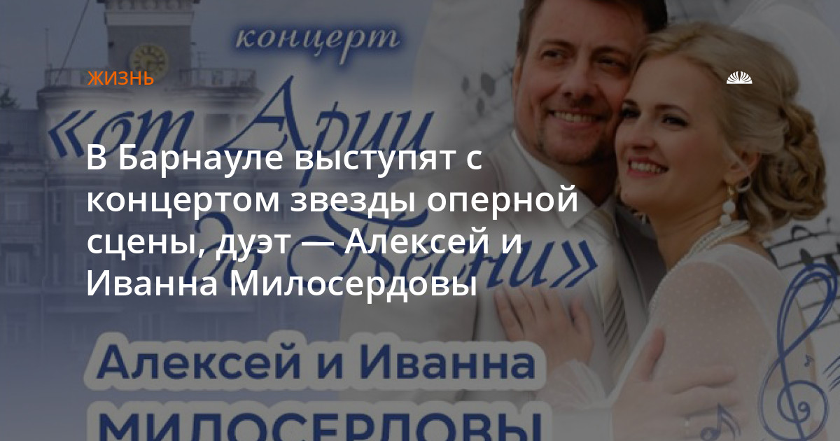 Алексей и Иванна Милосердовы — лауреаты международных конкурсов, солисты Алтайского музыкального театра. Это уже не первая сольная программа артистов, покоривших публику на лучших площадках России, Германии, Турции, Греции, Болгарии, Франции, Италии и Китая. А 13 октября они будут петь в Барнауле!