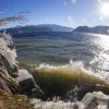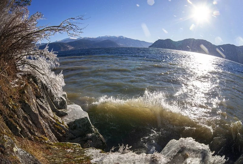 Пока ноябрь продолжает удивлять перепадами температур, верховье водоема начало реагировать на них первым. Морозные дни сменились на приятное тепло, после чего волны озера набрали силу и стали разбиваться о покрытый инеем и снегом берег.