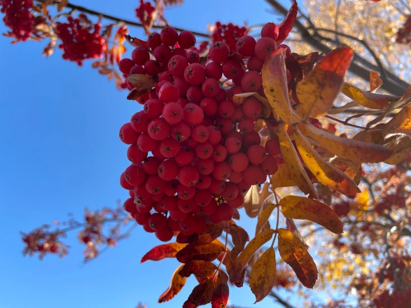 Осень раскрасила город яркими оттенками и превратила ярко-красную рябину в символ уходящего лета. Алые гроздья словно искры огня зажглись среди золотистых листьев.