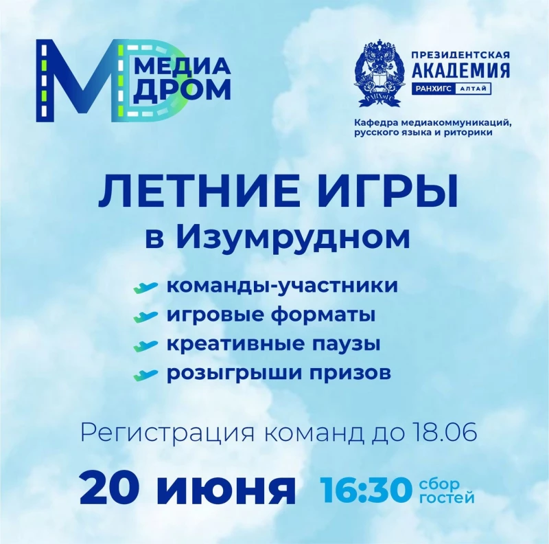 Приглашают студентов, профессионалов, абитуриентов и всех, кто увлечен медиакоммуникациями. Также сообщается, что сбор команд и гостей начнется в 16:30 в амфитеатре парка «Изумрудный».