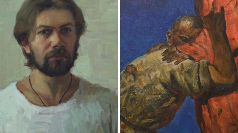 Экспозиция затрагивает и глубокую религиозную тему. Здесь можно увидеть одно из ключевых полотен выставки — монументальную работу Максима Руднева «Возвращение», посвященную притче о блудном сыне. Минимализм и контраст холодных и теплых тонов лаконично повествуют о пути от греха к очищению.