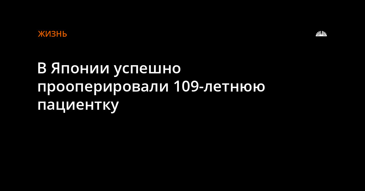 Операция по удалению аппендикса 109-летней японке была успешно проведена врачами больницы города Такацуки, сообщает РИА Новости со ссылкой на японские СМИ. Аи Оониси, родившаяся в октябре 1902 года, стала самой пожилой пациенткой в Японии, которой была проведена хирургическая операция.