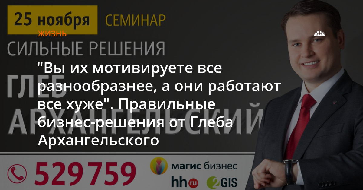 Глеб Архангельский время ценить умеет. Возможно, в этом секрет популярности его семинаров. Порой его формулировки звучат жестко: "Розовая пена" в современных теориях менеджмента", "Как получить более высокую отдачу от сотрудников, не повышая фонд оплаты труда"… Он готов обсуждать острые вопросы, ведь его главная цель – результат.