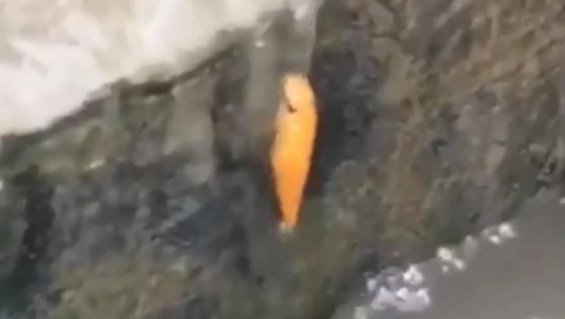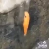 На кадрах видно, как маленькая оранжевая рыбка сосредоточенно взбирается на каменный парапет.