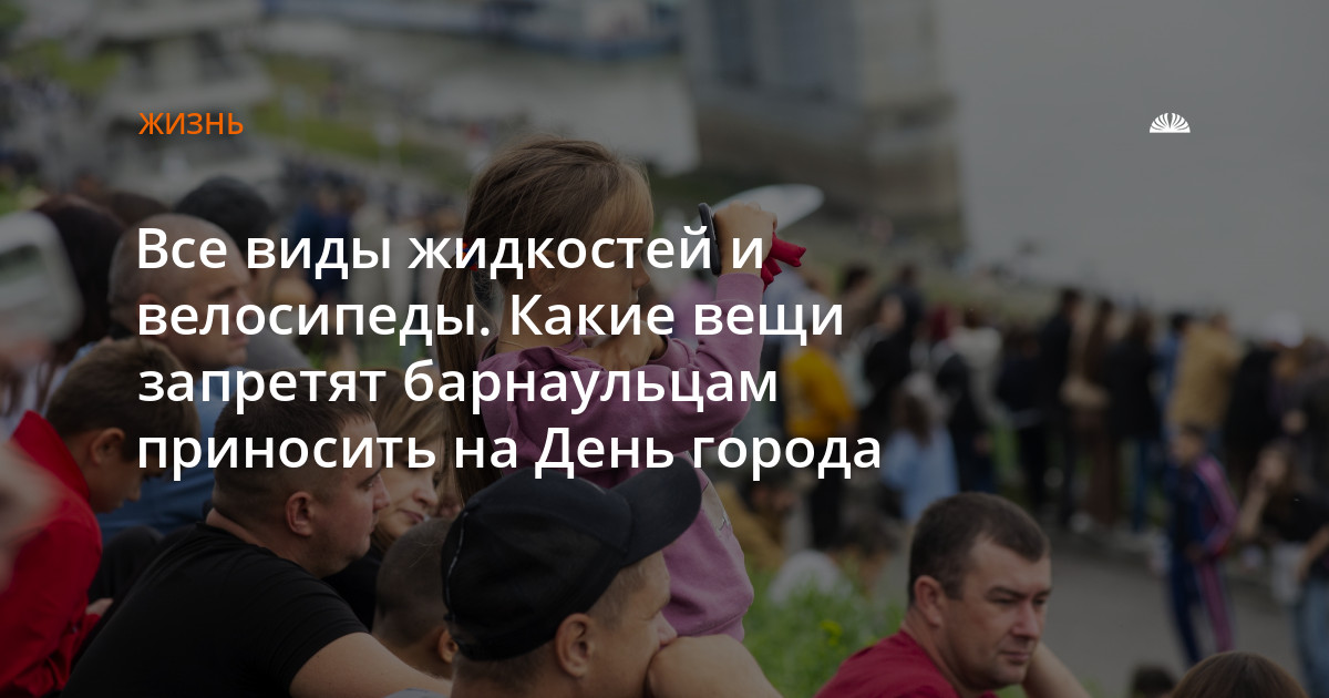 Жителям Барнаула в день праздника придется оставить дома медицинские лекарственные препараты без медсправки, вейпы, портативные устройства для зарядки техники (пауэрбанки, солнечные панели, любые беспроводные зарядные принадлежности), велосипеды, контейнеры для еды, бутылки и банки, все виды жидкостей, аэрозоли, воздушные шары и змеи.