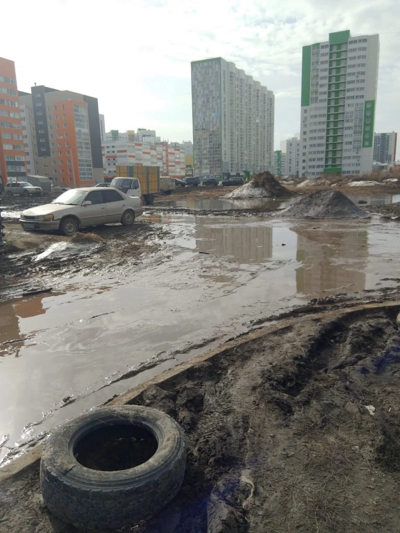 Дороги разрушены — три въезда во двор, два из которых превратились в грязевые ловушки, а третий перекопан из-за строительства медицинского учреждения. Автомобили застревают в грязи, буксуют мусорные машины и даже тракторы.